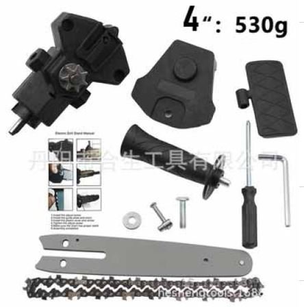 ADAPTADOR PORTATIL PARA FURADEIRA E PARAFUSADEIRA DESTINADO A CONVERTER A FERRAMENTA EM MINI MOTOSSERRA PARA CORTE E PODA. COMPOSTO POR CONJUNTO MECANICO COM PLACA GUIA TIPO SABRE DE 6 POLEGADAS, CORRENTE DE CORTE, DEFLETOR, ALCA AUXILIAR E ELEMENTOS DE FIXACAO. POSSUI HASTE HEXAGONAL PARA ACOPLAMENTO EM MANDRIL DE FURADEIRAS COMPATIVEIS. FABRICADO EM LIGA METALICA E COMPONENTES PLASTICOS. PRODUTO NAO ELETRICO, UTILIZADO EM ATIVIDADES DOMESTICAS, RURAIS E MANUTENCAO DE MADEIRA.
