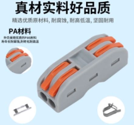 CONECTOR ELETRICO DE EMENDA TIPO ALAVANCA, MODELO 2 VIAS, FABRICADO EM MATERIAL PLASTICO COM CONTATOS INTERNOS EM COBRE, UTILIZADO PARA CONEXAO E DERIVACAO DE FIOS E CABOS ELETRICOS, COMPATIVEL COM CONDUTORES FLEXIVEIS E RIGIDOS, SUPORTA TENSAO MAXIMA DE ATE 250V E CORRENTE DE ATE 32A, SISTEMA DE FIXACAO POR ALAVANCA COM MOLA INTERNA, REUTILIZAVEL