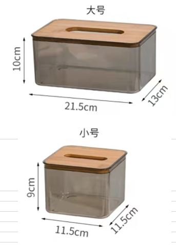 CONJUNTO DE PORTA TOALHA E PORTA LENÇOS DE PAPEL EM PLASTICO TRANSPARENTE E TAMPA EM BAMBU. DIMENSOES: 21.5X13X10CM E 11.5x11.5x9CM quantidade