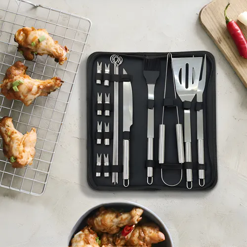 CONJUNTO DE UTENSILIOS PARA CHURRASCO COMPOSTO POR 18 PECAS, FABRICADAS EM ACO INOXIDAVEL, INCLUINDO PINCA, GARFO, FACA, ESPATULA, ESCOVA E ESPETOS. DESTINADO AO PREPARO E MANIPULACAO DE ALIMENTOS EM GRELHAS E CHURRASQUEIRAS.