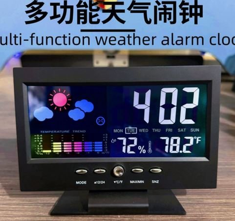/ DESPERTADOR DIGITAL ELETRONICO MULTIFUNCIONAL DE MESA, COM DISPLAY DE LCD, FUNCOES DE INDICACAO DE HORA, ALARME, TEMPERATURA AMBIENTE, UMIDADE RELATIVA DO AR, PREVISAO METEREOLOGICA GRAFICA. CORPO EM PLASTICO ALIMENTADO POR PILHAS