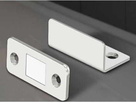 / FECHO MAGNÉTICO EM L. COMPOSTO POR DUAS PARTES, UMA PARTE COM ÍMÃ E OUTRA EM METAL COM FORMATO L PARA MANTER PORTAS E GAVETAS DE MOVEIS FECHADAS.