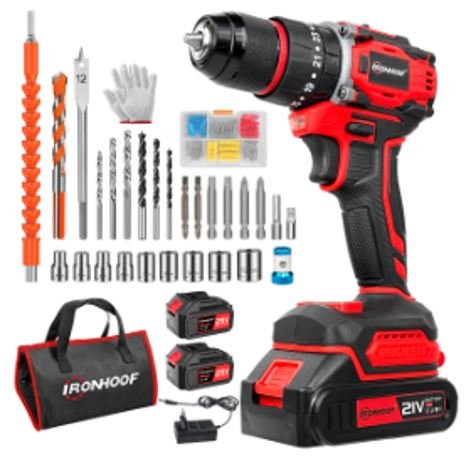 FURADEIRA/ PARAFUSADEIRA ELETRICA PORTATIL ALIMENTADA POR BATERIA RECARREGAVEL DE ION DE LITIO COM CONTROLE DE TORQUE E VELOCIDADE VARIAVEL, MANDRIL DE APERTO RAPIDO E FUNCAO REVERSIVEL. O KIT ACOMPANHA DUAS BATERIAS, CARREGADOR BIVOLT, CONJUNTO DE BROCAS HELICOIDAIS, PONTAS DE PARAFUSAMENTO (BITS), EXTENSORES PARA BITS, SOQUETES SEXTAVADOS, ADAPTADORES, ACESSORIOS PARA PERFURACAO E FIXACAO. INCLUI BROCAS LONGAS, ESCOVA E ACESSORIOS PARA LIMPEZA, ACOMPANHA BOLSA DE TECIDO PARA TRANSPORTE, MARCA IRONHOOF
