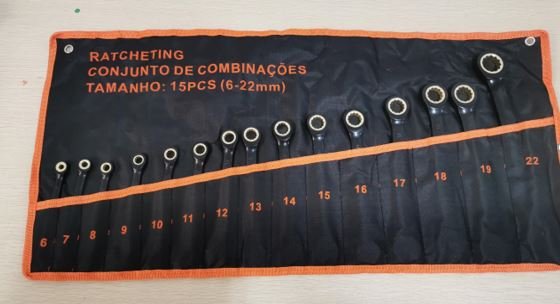 JOGO DE CHAVE CATRACA COMBINADA FEITAS EM ACO CROMO VANADIO DE TAMANHOS VARIADOS QUE VAO DE 8 ATE 19MM CONTEM 12 PECAS ACONDICIONADAS EM BOLSA DE TRANSPORTE
