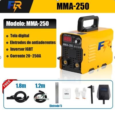 MAQUINA DE SOLDA ELETRICA INVERSORA, USO PROFISSIONAL, AJUSTE DE TENSAO E CORRENTE AUTOMATICO, ARCO TERMICO, MULTI FUNCIONAL MIG-TIG-MMA, COM SAIDA NOMINAL DE 250A, ADEQUADA PARA SOLDAGEM DE ACO CARBONO, FERRO, ACO INOXIDAVEL E OUTROS METAIS, FUNCIONA SEM CILINDRO DE GAS, COM CAPACIDADE PARA SOLDA DE 2 A 12MM, UTILIZA FIO DE SOLDA DE 0.6, 0.8 OU 1.0MM E HASTES DE SOLDAGEM MANUAL 2.0, 2.5 OU 3.2MM, ACOMPANHA MACARICO DE SOLDAGEM, FIO DE BASE DE 1.2 METROS, ARAME DE SOLDA DE 1.8 METROS, SOQUETE DE SOLDAGEM MANUAL, LUVAS DE SOLDAGEM, MARTELO DE ESCORIA, ALCA TRASEIRA, BICO CONDUTOR, VARETA DE SOLDA E ARAME DE SOLDA