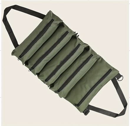 ORGANIZADOR DOBRAVEL PARA FERRAMENTAS, FABRICADA EM TECIDO DE POLIESTER, COM CINCO COMPARTIMENTOS COM ZIPER, UTILIZADA PARA ARMAZENAMENTO E TRANSPORTE DE FERRAMENTAS MANUAIS, COM ALCA PARA TRANSPORTE E FIXACAO