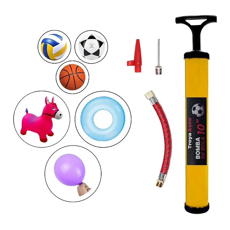 BOMBA MANUAL DE AR, ACIONADA MANUALMENTE, UTILIZADA PARA INFLAR ARTIGOS ARTIGOS COMO BOLAS, E OUTROS PRODUTOS. ACOMPANHA MANGUEIRA FLEXIVEL E BICOS ADAPTADORES