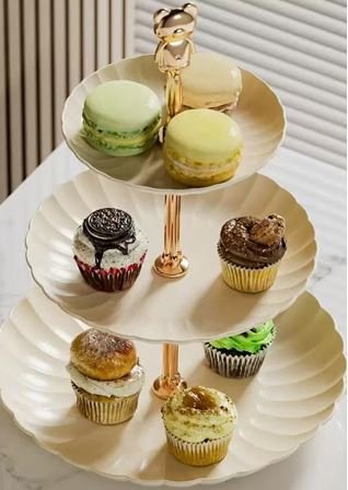 SUPORTE PARA DOCES, TIPO CAKE STAND, DE 3 ANDARES, FABRICADO EM PLASTICO, PARA USO EM MESA