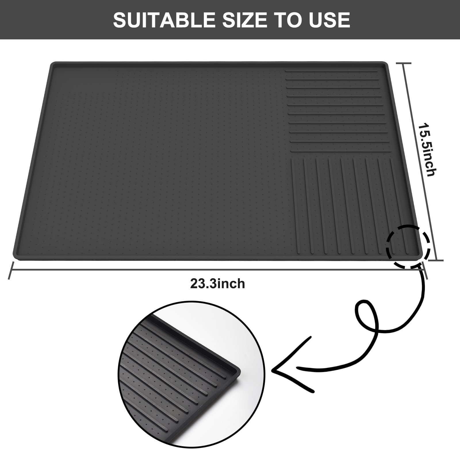TAPETE DE GOTEJAMENTO PARA MAQUINA DE CAFE FABRICADO EM SILICONE ANTIDERRAPANTE, COM ZONA DIVIDIDA PARA APOIO DE EQUIPAMENTOS E AREA DE DRENAGEM. POSSUI BORDAS ELEVADAS PARA CONTENCAO DE LIQUIDOS, ABSORCAO DE VIBRACAO E REDUCAO DE RUIDO. DIMENSOES APROXIMADAS 32 X 22 X 3 CM, COR PRETA.