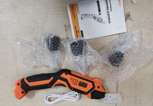 TESOURA ELETRICA PORTATIL COM FUNCIONAMENTO RECARREGAVEL A BATERIA. CADA TESOURA ACOMPANHA LAMINA EXTRA E CARREGADOR COM FIO, MARCA AITOOLZO