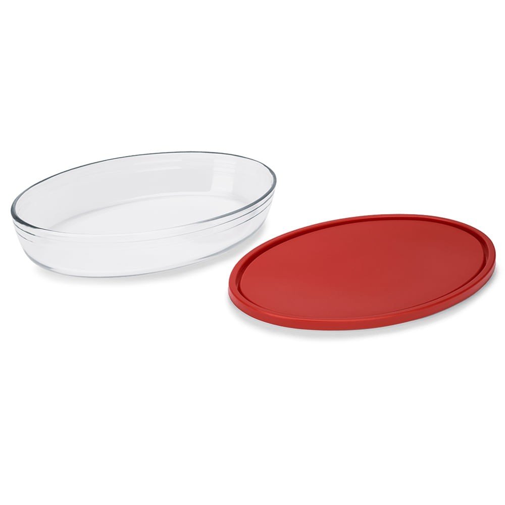 TRAVESSA OVAL EM VIDRO OPALINO TEMPERADO BRANCO COM TAMPA EM PLÁSTICO,